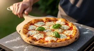 Once the crust is golden and the cheese is bubbly, carefully remove the pizza from the stone. Let it rest for a few minutes before slicing and serving.